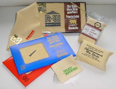 Echte Fensterlederartikel, ob als Fenster-/ Autoleder-Tuch/-lappen- in vielen verschiedenen Größen, Preislagen und diversen ansprechenden Geschenkverpackungen oder als Echtleder-Schwammkissen;